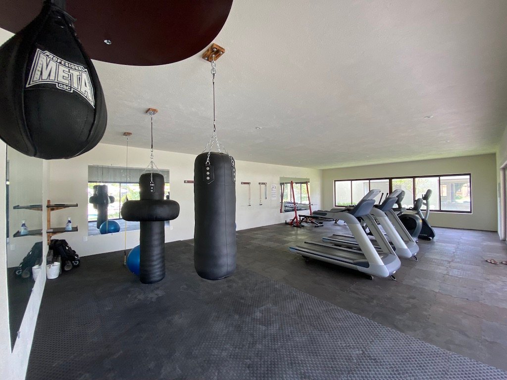 - Well-equipped gym with a scenic view of the pool and green areas.