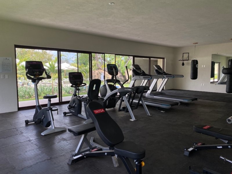 - Well-equipped gym with a scenic view of the pool and green areas.