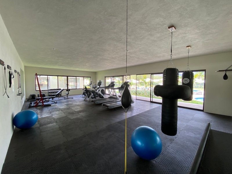 - Well-equipped gym with a scenic view of the pool and green areas.