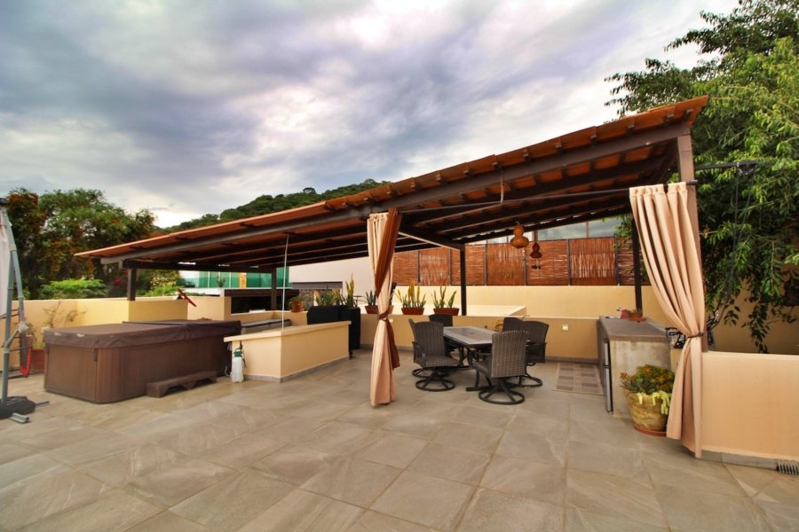 Mirador Elegance: This covered and open space boasts a jacuzzi, making it the perfect spot for relaxation, alongside a fully-equipped bar area with a wine cooler, refrigerator, and sink.