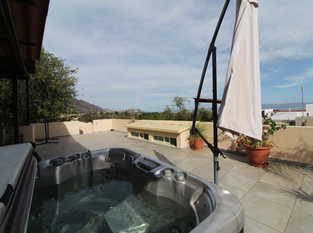 Mirador Elegance: This covered and open space boasts a jacuzzi, making it the perfect spot for relaxation, alongside a fully-equipped bar area with a wine cooler, refrigerator, and sink.
