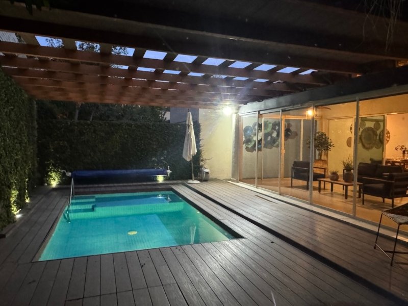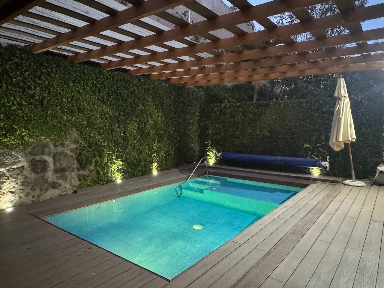 - Solar-heated dipping pool with imitation wood deck and pergola
